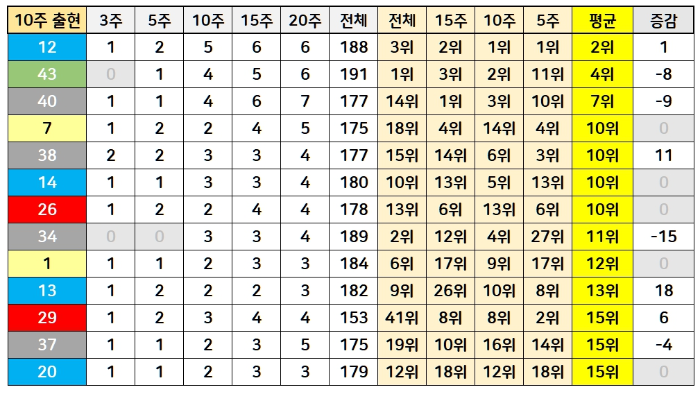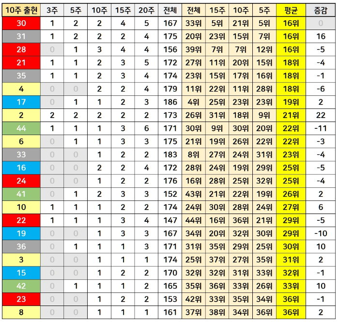 평균 순위는 기간별로 당첨횟수를 계산하여 횟수를 출현순위로 환산합니다. 그리고, 전체, 15주, 10주, 5주 순위를 평균낸 순위입니다.