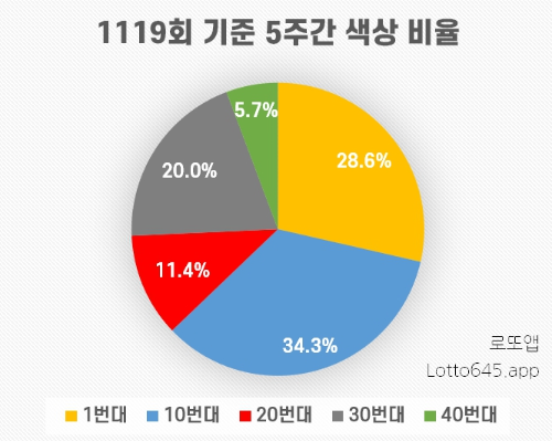 최근 5주간 색상 비율을 보면, 노랑색(1번대) 28.6%, 파랑색(10번대) 34.3%, 빨강색(20번대) 11.4%, 회색(30번대) 20%, 녹색(40번대) 5.7% 비율로 나타났습니다. 이러한 비율을 참고해 예상번호를 선택하는 것이 좋습니다.