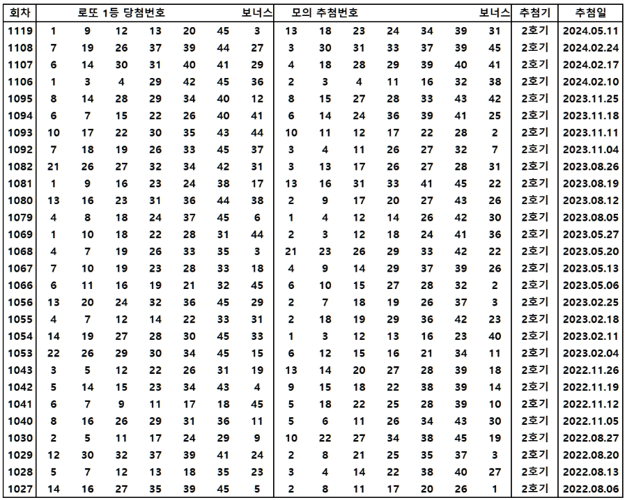 이번 글에서는 로또복권 1119회 당첨번호 결과와 동행복권 1120회 모의번호 추첨 분석을 통해 1120회 로또 당첨번호를 예측해 보았습니다. 자주 나오는 번호와 2호기 번호의 특징을 고려하여, 1120회 예상번호를 제시했습니다.